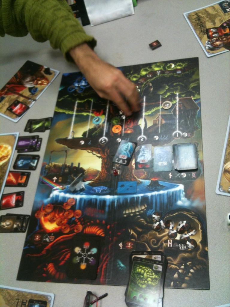 Y nada, tras el Génova, abandono generalizado de la Sala del Trono (esTronadores e Invitado de trHonor, ¡gracias gracias!), aunque el gran Lord Lucas nos obsequió nuevamente con su compañía y no pudo sino caer un Ascension: Chronicle of the Godslayer junto a Lord Krodash y yo mismo. Explicación de este juego de tipo Dominion y ala, a pegarse con criaturas malvadas, convocar a héroes y construir cosas con tal de ganar el honor suficiente como para ser elegido como aquel que desafie al Dios Caído, para ser elegido...¡the Godslayer! ¿La partida? Muy igualada hasta que a los bichos mecánicos les dio por venirse conmigo y a partir de ahí a base de mamporros robóticos no hubo demonio ni mala bestia que se tuviera en pie. Muy chulo el jueguillo, gracias por enseñárnoslo, ¡Señor del Ortigal!